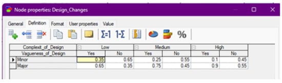 Once the model structure was finalized, the next crucial step involved assigning conditional probabilities to nodes. These probabilities reflect the dependencies between variables, indicating how the state of one node influences the others. Given the lack of data from completed PPP hospital projects in Turkiye, expert assessments were used to estimate these probabilities. Experts were asked to evaluate the likelihood of specific outcomes under various parent node conditions using verbal probability categories such as low, medium, and high. A predefined probability mapping system was used to translate these subjective judgments into quantifiable inputs. Verbal terms were associated with specific numerical intervals (e.g., Low = 10–20%, Medium = 20–30%, High = 30–45%), and the midpoint values (15%, 25%, 37.5%) were used for calculations. After each expert developed their CPTs individually, a group session was held to compare and reconcile the differences. The Delphi method was used to harmonize diverging views. In this process, the experts reviewed each other’s estimates anonymously, discussed discrepancies, and iterated their inputs until a consensus was reached. A consensus threshold of ±5% was used to define acceptable agreement across expert inputs for each conditional probability entry. If any probability estimates diverged beyond this threshold, further clarification was requested, and a final revision was made through facilitated discussion. In the rare cases where disagreements persisted, the mean value of the proposed estimates was used. The finalized CPTs were then incorporated into the corresponding nodes within the GeNIe software to enable structured analysis and decision-making. An example of a CPT for “design changes” (Screenshot from GeNIe) is provided in Figure 3 as an illustrative example of how the likelihood of outcomes can vary based on different input factors. An example of the input data used to construct the CPTs is also provided in Table 4 for the “delay in construction” factor.