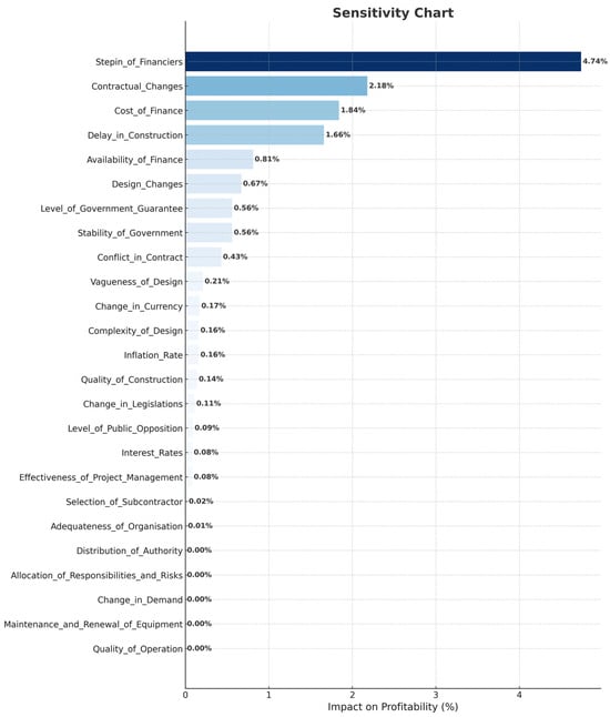 A sensitivity analysis was performed to assess how changes in the model’s input parameters affected its outputs, measuring the model’s sensitivity to variations in key variables. This test involved calculating the expected profitability of the contractor under various extreme conditions, categorized into low (10–20%), medium (20–30%), and high (30–45%) profitability scenarios. The test provided a range of possible outcomes for different risk factors, such as the best- and worst-case scenarios for factors like government stability, changes in legislation, subcontractor selection, and construction delays. The analysis was visualized using a tornado graph, highlighting the most sensitive risk factors, such as “Step in of Financiers”, “Contractual Changes”, and “Cost of Finance”, which had the most significant impact on profitability predictions. A tornado graph is presented in Figure 5.