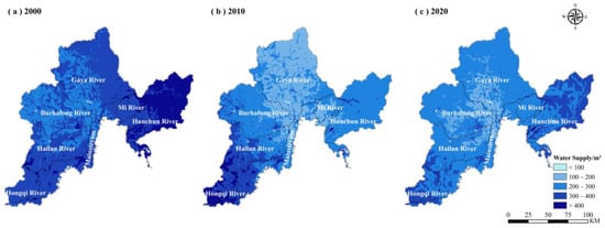 Between 2000 and 2020, the basin experienced a gradual decline in water demand, with the most significant reductions occurring in the central regions (Figure 5 and Table A1). The total annual demand decreased by 11.4%, from 0.467 × 109 m3 to 0.413 × 109 m3, accompanied by a reduction in the per-unit demand intensity of 0.024 × 105 m3/km2. Sub-basin trends revealed that the Gaya River sub-basin experienced the steepest demand decline (a 15.6% reduction). The Hailan River and Tumen River Mainstream basin showed more moderate reductions. In contrast, the Hongqi River sub-basin was the only area where demand increased, rising by 17.1%.
