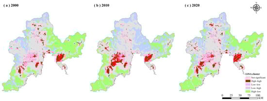 Between 2000 and 2020, spatial mismatch patterns shifted markedly (Figure 8 and Table 6). The prevalence of HL-type zones initially declined from 54.2% (2000) to 40.1% (2010) before rebounding to 49.8% (2020). LL-type zones gradually expanded into the northeast, while LH-type and HL-type zones remained stable, fluctuating within 1% of their original coverage.