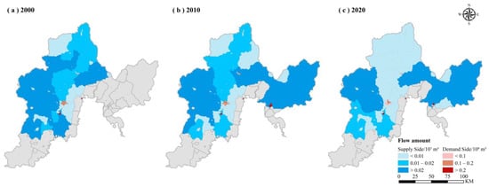 Between 2000 and 2020, the Tumen River Basin exhibited consistent yet evolving dynamics in water yield service flow (Figure 8). By 2020, service flows remained muted in the northern and southern reaches while rising markedly in the eastern and western sectors. Supply-side contributions fell sharply—from 0.025 × 109 m3 in 2000 to 0.017 × 109 m3 in 2020—with a brief peak in 2010 (Table 7). Notably, San Daowan Township (Yanji City) remained the largest supply contributor in 2020 (0.0037 × 109 m3, 21.7%), followed by Mingyue and Laotougou townships. Conversely, demand-side flows climbed from 4.363 × 109 m3 in 2000 to 4.515 × 109 m3 in 2020. Jinghe Subdistrict (Hunchun City) alone absorbed 30.6% of the basin’s water demand, outstripping other urban centers such as Xinhua (22.4%) and Xiangshang (13.1%) subdistricts in Tumen City. These shifts reflect growing urban pressures in demand hotspots alongside constrained supply capacities in upstream zones, underscoring the need for spatially adaptive management strategies.