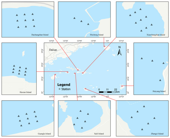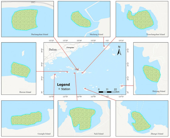 This study examines a representative seagrass bed habitat in the northern Yellow Sea, specifically in the Changshan Islands, situated off the eastern coast of the Liaodong Peninsula. The study area lies between 122°17′–123°13′ E and 38°55′–39°35′ N (Figure 1). These islands, entirely surrounded by seawater, are geographically positioned to the west across the sea from Dalian City, Jinzhou District, and Pulandian District. Their unique location makes them significant both for marine ecosystem research and for the sustainable development of the marine economy. The survey encompasses the waters surrounding eight islands: Guanglu Island, Dawangshan Island, Haxian Island, Xiaochangshan Island, Haiyang Island, Zhangzi Island, Saili Island, and Shicheng Island.