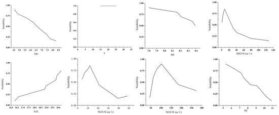 This study uses sea temperature, DO, pH, SS, and nutrients as environmental variables to assess habitat suitability [17]. These indicators are directly related to the physiological and ecological processes of seagrasses, and can comprehensively reflect the health status of seagrass bed ecosystems. Moreover, they are easy to monitor, ensuring the accuracy of the assessment results and the applicability of the methodology. Based on the field survey results, the suitability index for each environmental variable was calculated, summarized in Table 2, and the suitability curves were plotted (Figure 3).