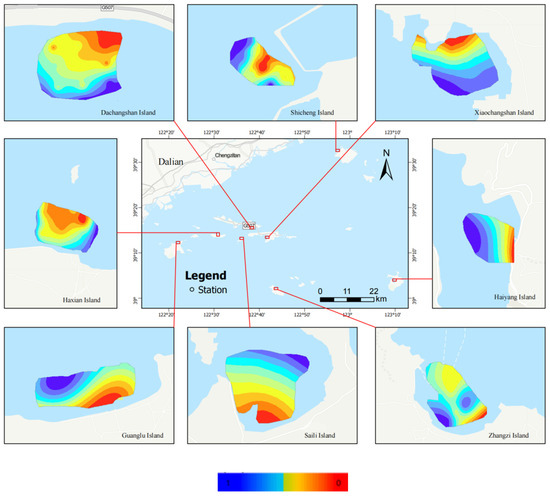 In Figure 4, the color range from red to dark blue represents an HSI range from 0 to 1. The red region indicates that the water quality function has degraded, and the ecological environment has been severely damaged, making it unsuitable for seagrass survival. Conversely, the blue region represents areas highly suitable for seagrass growth. The intermediate colors reflect the gradual transition in suitability, as shown in Figure 4 [25]. Based on the analysis of the habitat suitability distribution map of seagrass beds in the study area, significant differences in habitat suitability can be observed among different islands. Overall, except for Haxian Island, most islands exhibit relatively low habitat suitability in their surrounding waters. In particular, coastal areas generally have lower habitat suitability, while suitability improves gradually as the distance from the shore increases.