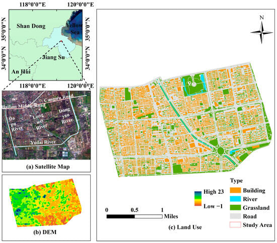 The study area selected for this research was Haizhou District in Lianyungang City, bordered to the south by Hailian Middle Road and Cangwu Road, to the north by Yudai River, to the west by Dapu River, and to the east by Dongyan River. The area is surrounded by water on three sides, covering a total area of approximately 12.68 km2. Longwei River flows through the area, dividing it into eastern and western sections. The western section, which contains the old city, has a lower proportion of green space and reduced runoff reduction potential, while the eastern section, being densely populated, has a higher demand for runoff reduction. The significant land use differences between the eastern and western sections create favorable conditions for the application of the CT mechanism. The impervious surface area in the study area accounts for 80.3%, as shown in Figure 2. The region’s soil types, primarily sandy and clay, exhibit good permeability. However, due to extensive land development, urbanization, and frequent extreme weather events such as storm surges and typhoons along the coast, the traditional drainage system can no longer manage the excessive stormwater runoff, resulting in local flooding. These challenges are widespread in many cities across China. According to the “Technical Guidelines for Sponge City Construction” [27], the annual runoff control rate in Lianyungang City should reach 70%. The “Lianyungang Sponge City Special Plan (2016–2030)” [28] stipulates that the runoff coefficient for urban construction land should be maintained below 0.49 by 2030.