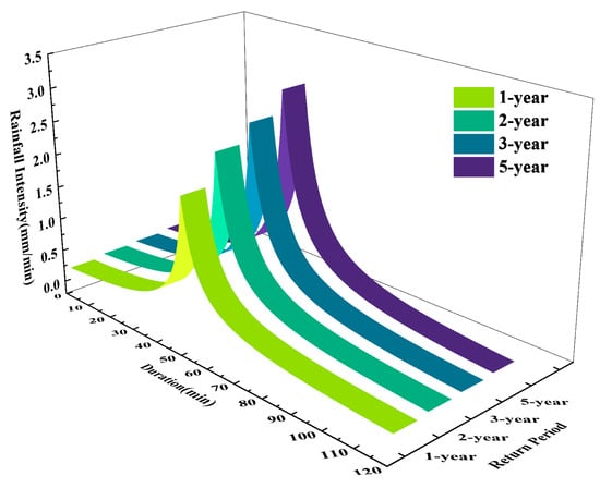 Using the revised design storm intensity Formula (1) from the Lianyungang Meteorological Bureau, we set the design rainfall duration to 2 h, with a peak rain factor of r = 0.417. To more accurately represent rainfall scenarios and stormwater response characteristics for different return periods, we employed the Chicago Rainfall Model to generate rainfall processes. The rainfall scenarios for the study area encompassed the 1-year, 2-year, 3-year, and 5-year return periods, as shown in Figure 3.