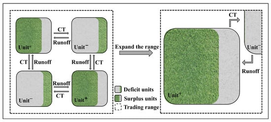 As shown in Figure 4, when their own runoff reduction demands cannot be fully met, deficit units “transfer” runoff to surplus units to achieve runoff targets. Surplus units typically have strong rainwater infiltration capacity, while deficit units need to rely on LID facilities or the CT mechanism to achieve their control objectives. Through the “trading” of runoff, the reduction potential of surplus units can be “transferred” to deficit units, thereby optimizing resource allocation, reducing the construction area of LID facilities, and further enhancing overall runoff reduction efficiency.