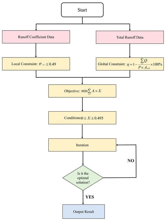 In the study area, three types of LID facilities were selected, rain gardens, green roofs, and permeable pavements, to accommodate different land use requirements. Previous studies have demonstrated a significant linear relationship between the proportion of LID facilities, the runoff coefficient, and the total runoff volume [40]. When configuring LID facilities, constraints such as runoff coefficients and runoff control rates are typically expressed as inequalities. SLSQP can directly integrate these inequality constraints into the optimization process and determine the optimal solution while ensuring constraint satisfaction [41]. This feature makes SLSQP particularly suitable for optimizing LID facility configurations under multiple inequality constraints. The SLSQP optimization process is illustrated in Figure 5. The formula is as follows.
