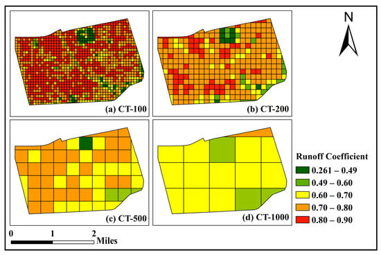 One of the core objectives of Sponge Cities is to reduce urban flooding and runoff pollution through source control and decentralized management measures. The 2-year return period rainfall event, due to its higher frequency, has a particularly significant impact on urban hydrological processes [42]. These frequent rainfall events cause localized water flow concentration, leading to localized flooding issues. Furthermore, according to the GB50014-2021 “Outdoor Drainage Design Standards” [38], the design return period for stormwater drainage networks in medium and small cities is between 2 and 3 years. Therefore, selecting the 2-year return period as the optimization target effectively reflects the regulatory effects of Sponge Cities in managing high-frequency rainfall events. The research results indicate that, in the absence of LID facilities, there is a significant negative correlation between the composite runoff coefficient and the trading scale. The composite runoff coefficients for CT-100, CT-200, CT-500, and CT-1000 are 0.763, 0.741, 0.692, and 0.634, respectively. This indicates that larger trading scales (e.g., CT-500 and CT-1000) enable surplus units’ runoff reduction potential to be more fully traded to deficit units, resulting in better runoff reduction effects. In contrast, smaller trading scales (e.g., CT-100 and CT-200) lead to higher composite runoff coefficients for the study area because surplus units’ reduction potential is not fully traded relative to deficit units. Additionally, a negative correlation exists between the surplus area and trading scale. This is primarily due to the excessive expansion of the trading scale, where more deficit areas are included when trading with local surplus areas. As a result, surplus areas cannot accommodate the needs of the newly included deficit areas, leading to surplus units being overloaded. The surplus areas are presented in Table 5, and the runoff coefficient distribution map is provided in Figure 6.