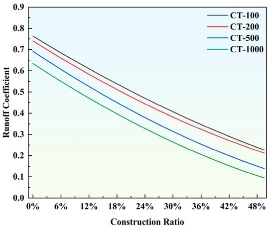 This study examines the impact of different trading scales and construction proportions on runoff reduction effects by gradually increasing the proportion of LID facilities (0–49.5%) across varying trading scales. The results, shown in Figure 7, indicate a significant decrease in the runoff coefficient as the LID facility construction proportion increases, confirming the effectiveness of LID facilities at different scales [43]. The data show that, in the absence of LID facilities, the initial runoff coefficients for CT-100, CT-200, CT-500, and CT-1000 are 0.763, 0.741, 0.692, and 0.634, respectively. As the LID facility proportion gradually increases to 49.5%, the runoff coefficients decrease to 0.227, 0.213, 0.139, and 0.095, representing a reduction of over 70% for each trading scale. Among these, the runoff coefficient for CT-500 shows the largest reduction, reaching 0.553.
