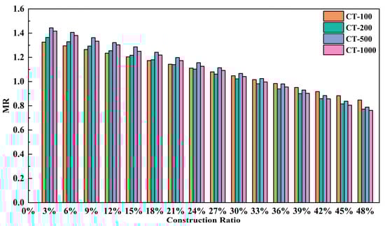 Excessive increases in construction intensity result in diminishing returns on construction benefits. To quantify the benefits of various proportions of LID facilities, this study introduces the Marginal Rate (MR) indicator, which measures the reduction in runoff coefficient benefits achieved by increasing the construction proportion by 3%. The calculation formula is presented as follows: