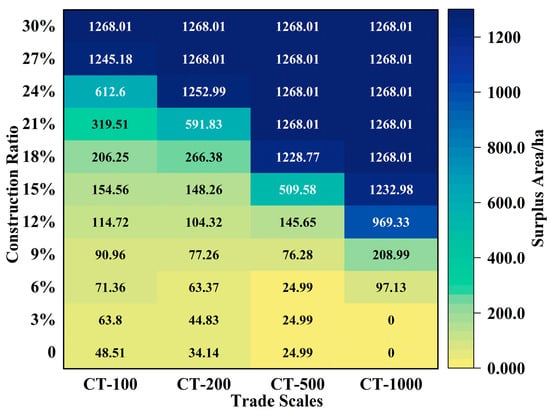 As the proportion of LID facilities increases, the relationship between the trading scale and surplus area gradually becomes clearer; however, noticeable differences remain in performance across different trading scales. As shown in Figure 9, when the construction proportion of LID facilities is relatively low (e.g., 0–9%), the increase in surplus area for different trading scales is gradual and does not exhibit a significant upward trend. However, as the construction proportion increases, the impact of trading scale expansion on the surplus area becomes more evident. When the construction proportion reaches 12%, the surplus area for CT-1000 increases significantly; CT-500 begins to show significant growth at 15%, while CT-200 and CT-100 show significant growth only at 21% and 24%, respectively. When the construction proportion reaches 18%, all units in CT-1000 satisfy the runoff coefficient requirement. At this point, the surplus area for CT-100 reaches only 206.25 ha or just 16.27% of the study area, indicating that smaller trading scales at low construction proportions are insufficient on their own to achieve the same results as larger trading scales, which rely on more extensive regional transactions.