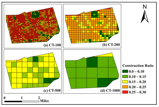 Under the condition of meeting local constraints ( ≤ 0.49), the distribution of construction proportions varies significantly across different trading scales, as shown in Figure 10. In smaller trading scales (e.g., CT-100), notable differences in construction demand are mainly driven by high-density areas such as built-up zones and transportation hubs. These areas require a higher proportion of LID facilities to meet runoff reduction targets due to their larger runoff volumes. In contrast, permeable areas such as green spaces require fewer facilities, and in some cases, they require none. However, the runoff reduction potential in these permeable areas is not fully utilized by the CT mechanism, leading to surplus resource waste and reduced allocation efficiency. As the trading scale increases (e.g., CT-200 and CT-500), the runoff reduction potential of surplus units is gradually transferred to deficit units. This transfer leads to a more balanced spatial distribution of construction proportions. For example, in CT-500, the construction proportion in high-demand areas significantly decreases, and most units require only 10–20% of LID facilities to meet the runoff coefficient requirement. At the maximum trading scale (CT-1000), the resource integration effect is further optimized, and the construction demand for all units becomes more uniform, with significantly reduced construction proportions. This result aligns with the conclusions drawn from Xu et al. [23], which indicate that construction intensity decreases as the trading area expands. Specifically, the required LID facility areas to address all surplus needs for CT-100, CT-200, CT-500, and CT-1000 are 284.67 ha, 256.34 ha, 195.09 ha, and 141.81 ha, respectively. Correspondingly, the runoff coefficients were reduced by 0.283, 0.261, 0.212, and 0.153. These results indicate that expanding the trading scale can effectively optimize resource allocation, reduce construction demands, and achieve more balanced resource distribution and runoff reduction objectives. Overall, smaller trading scales show more significant variation in construction demands across different units, whereas larger trading scales effectively reduce the construction demand in high-density areas through CT, resulting in a lower degree of dispersion in the construction intensity distribution.