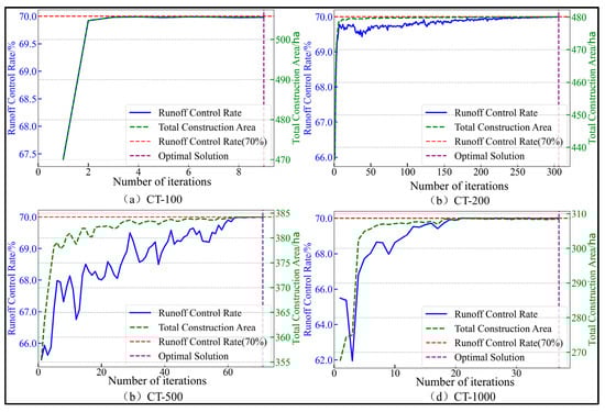 Figure 11 illustrates the iterative optimization process of the runoff control rate and construction area across different trading scales. CT-100 requires only nine iterations to reach the optimal construction plan, mainly due to the tolerance settings of the optimization model. The algorithm terminates when the change in the objective function value (construction area) is less than 0.001. Additionally, CT-100 has more grid units with reduced mutual influence between them, allowing the construction proportion of each unit to be more independent. Therefore, the optimization algorithm can adjust most units simultaneously, rapidly finding the global optimal solution.