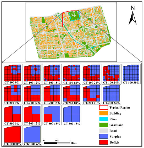In the absence of LID facilities, the study found that surplus areas were primarily concentrated in the typical regions shown in Figure 12, which were selected for analysis. The analysis indicates that this typical region contains a large permeable area, which serves as the primary source of surplus units in CT-100, CT-200, and CT-500. However, in CT-1000, due to the larger trading scale, the surplus potential is distributed across a broader range of deficit areas, leading to insufficient surplus capacity to fully balance the global deficit. As a result, CT-1000 appears in a deficit state when no LID facilities are present. Further comparisons of the surplus distribution characteristics at different construction proportions and trading scales reveal that larger trading scales often derive their surplus from the local surplus areas of smaller trading scales. This is primarily because, during the expansion of the trading scale, the runoff reduction potential of surplus areas is gradually “transferred” to deficit areas through the CT mechanism. Consequently, larger trading scales exhibit more significant surplus effects.