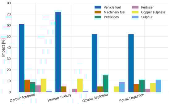The results for the vineyard phase are categorized into the following four impact categories (see Figure 3): carbon footprint, human toxicity, depletion of fossil energy, and depletion of the ozone layer. It is important to note that only inputs representing more than 1% of the total are considered in the analysis, while the rest are deemed less relevant.
