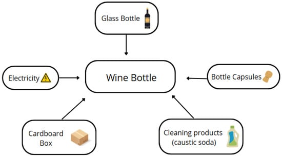 In this phase, the same impact categories as those in the vineyard phase are analyzed, and the main inputs are identified (see Figure 4). As in the vineyard phase, only inputs with a percentage higher than 1% are considered. As we can observe in the figure, the central product is the wine bottle, which is the target of the process, and for this, all the surrounding inputs are necessary.
