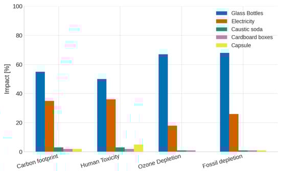 As in the vineyard phase, the following two inputs are present in all impact categories and have a significant weight in each of them: glass bottles and electricity consumed in the winery (see Figure 5). This is not a particular finding of this research; it is consistent with various studies where bottles are identified as one of the main contributors to environmental impacts due to the high electricity consumption required for their production [31,37,39,40,42,43].