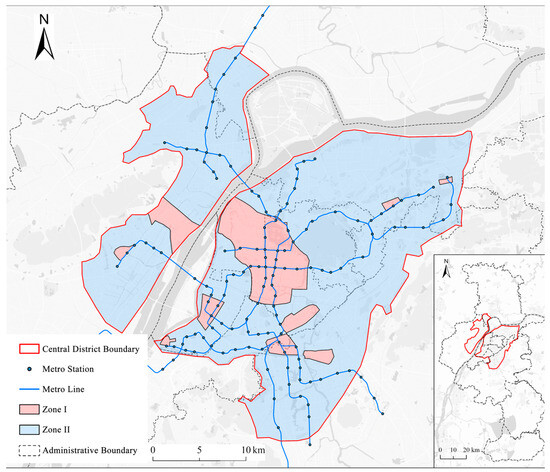 This study focuses on Nanjing’s central urban area, delineated in the drafted Nanjing Territorial Spatial Planning (2021–2035), comprising the traditional Jiangnan core and the emerging Jiangbei new core (