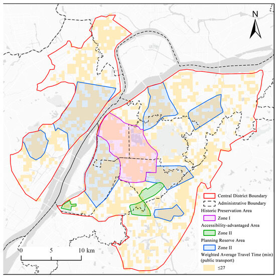 This study optimizes the parking zoning scheme by integrating land-use dynamics and transportation conditions, utilizing a 27 min threshold (the 35th percentile) for accessibility stratification as follows: