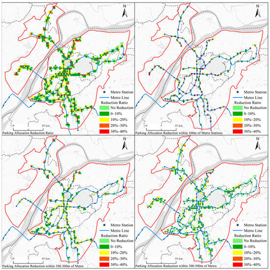 This section focuses on the practical applications of parking allocation reduction policies. First, regarding zonal parking reductions, this study defines the reduction margins for the minimum parking requirements in Zone I and Zone II relative to Zone III baselines. Second, for parking reductions near metro stations, the proportional reductions in parking provision standards for public buildings are calculated across varying distance thresholds (e.g., 100 m, 300 m, and 500 m). Finally, a comprehensive framework is proposed to avoid overlapping reductions by integrating the zonal classifications and distance thresholds of metro stations, supplemented by a grid-scale reduction calculation method to provide holistic decision-making support for urban parking planning practices.