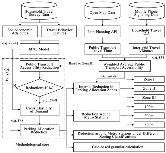 12]. The cross-elasticity of the automobile travel probability relative to the public transportation travel time serves as the pivotal mechanism for translating accessibility gains to parking reductions. An empirical analysis is conducted in Nanjing’s central urban area to validate this methodology. This research provides a referential framework for formulating parking allocation policies for public buildings, facilitating the rational allocation of urban transportation resources and advancing transit-oriented urban development.