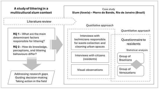 To meet the defined objective, this project was guided by two research questions (RQs) (Figure 1): the first concerns identifying the main factors responsible for the large amount of litter in the Morro do Banco slum (RQ1); and the second concerns examining whether statistically significant differences in the knowledge, perceptions, and littering behaviours between Brazilian and Venezuelan nationals exist (RQ2). Answering these questions allows for the development of a deeper understanding of the littering phenomenon in multicultural slum settings, as well as helping us to identify the most effective interventions to reduce littering.