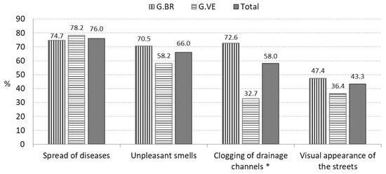 The respondents were asked about the problems caused by littering because knowledge of this can motivate more appropriate disposal behaviour. As the results in Figure 2 demonstrate, the majority associated littering with the spread of diseases (76.0%) and unpleasant odours (66.0%), which corresponds with the results obtained from the interviews with residents. However, statistically significant differences were noted regarding the clogging of drainage channels, recognised by 72.6% of G.BR and only 32.7% of G.VE (χ2 (1) = 22.770; p ≤ 0.000; V = 0.390).