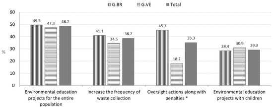 Measures to minimize the problem of litter. Legend: G.BR—Group of Brazilian residents; G.VE—Group of Venezuelan residents. * Statistically significant differences between the groups (p ≤ 0.05).