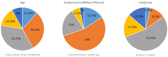 This section describes the descriptive statistical analysis of the sample data, the quantitative and qualitative analyses of responses to each item in the questionnaire, and the impact of each variable on the deterioration of vehicle battery performance. The questionnaire items included age, family income, family size, and other questions related to respondents’ basic personal information. Although these items were not the major subjects of the present study, they are indispensable components of social surveys, because the analysis of their descriptive statistics provides the perspective necessary for subsequent data analyses. Figure 1 shows the statistics of respondents’ basic information. First, the age distribution was centered around 26–35 years, accounting for 66% of the total, whereas the number of people under or above this age range was relatively small. In other words, EV owners were largely young people in their 20s and 30s, which is consistent with the characteristics of the EV consumer market. In terms of family income, respondents with an annual income of 4–8 million JPY accounted for the majority (54%), followed by 21% and 15.75% with an annual income of 8–12 million JPY and <4 million JPY, respectively; meanwhile, very few respondents had an annual income of over 12 million JPY. As the prices of EVs are higher than those of most gasoline vehicles, the families of EV owners must have a certain level of economic strength. According to the age distribution, however, most of the respondents were under 35 years of age, and the income of individuals in this age group is not very high; therefore, it was reasonable that the respondents’ annual family income was mainly below 12 million JPY in the survey. Regarding family size, the percentage of households with three people was the highest, at 53.75%. Although there were few families with four or more than five people, they accounted for a considerable proportion. We assumed that with an increase in family size, the load of the EV would increase, accelerating the deterioration of vehicle batteries.