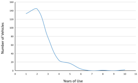 Subsequently, a descriptive statistical analysis of the key evaluation elements of the questionnaire was conducted. Figure 2 shows the number of EVs by years of use. Most EVs were 3 years old, and almost no EVs were in use for over 6 years. Despite China’s promotion of R&D and the popularization of EVs constituting a national policy since 2010, the actual popularization of EVs began in the country in 2015. Therefore, as is evident from the survey results, the years of EV use were very short. In addition, we assumed that the batteries of EVs that were manufactured over 5 years ago would deteriorate rapidly after being used for approximately 6 years, and then the EVs would become EOL vehicles.