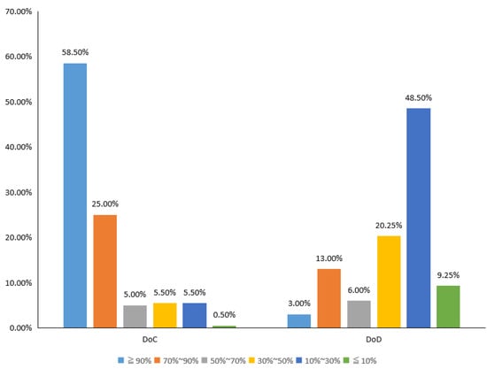 The DoC and DoD of EVs in Figure 4 indicate the ratio of the SOC of batteries when the EV owners charge and discharge at regular times. Charging EV batteries to >90% was the highest for DoC, and discharging the batteries to 10–30% was the highest for DoD. In this regard, we believe that most EV owners select “full charge” for convenience, without worrying about the performance deterioration of the vehicle battery due to overcharging. However, unlike during charging, if the SOC of the battery is very low during discharging, this may significantly damage the battery. In particular, if the battery is discharged to <10%, the performance of the EV may decrease significantly and the vehicle may stop operating. Therefore, it is common to start charging when the SOC of the battery drops to 10–30%.