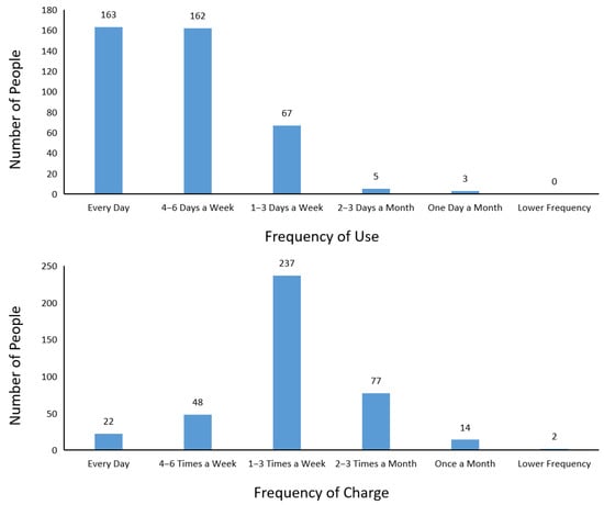 In general, the more frequently an EV is used, the more frequently it is charged. In addition, the lifespan of the battery is directly related to the charge/discharge cycles; therefore, we assume that the frequency of the use and frequency of charge of EVs are important indicators for evaluating the residual performance of vehicle batteries. Figure 5 shows the frequency of use and frequency of charge of EVs, as well as the corresponding number of EV owners. In terms of the frequency of use, most people use their EVs every day or 4–6 days a week, whereas in terms of the frequency of charge, the majority charge their EVs once to thrice a week. In other words, even if EV owners use the vehicles every day, they charge them approximately every 2–3 days.