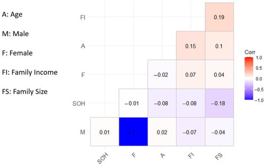 The free statistical software RStudio (version 2022.07.2+576) was used to perform correlation analysis on the sample data. Specifically, the correlations between the explanatory and objective variables were analyzed. In the present study, battery SOH, which indicates the residual performance of vehicle batteries, was selected as the objective variable, whereas the other evaluation items were considered the explanatory variables. In other words, a correlation analysis was performed based on the relationship between each evaluation item and the SOH of the battery. Given the large number of evaluation items, the analysis was divided into three parts: the basic information of the respondents, the vehicle usage status, and the vehicle charge status.