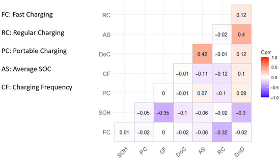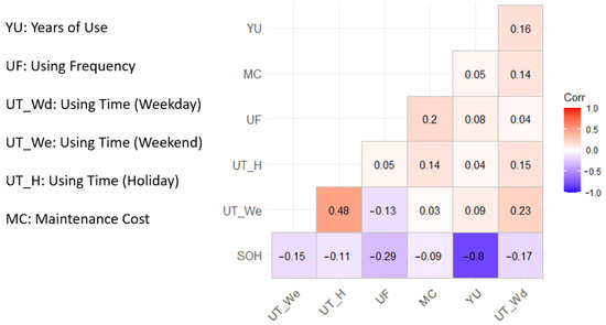Figure 7 shows the analysis results of the correlation between the vehicle usage status and the battery SOH. The correlation coefficient between the battery’s years of use and SOH is −0.8, and the p-value is 0.000; therefore, these two variables show a strong negative and significant correlation at the 1% level. Similarly, the EV use frequency and battery SOH show a weak negative but significant correlation at the 1% level. However, the other variables related to the vehicle usage status, such as EV’s usage time in different periods and maintenance costs, are not directly correlated with the battery SOH.