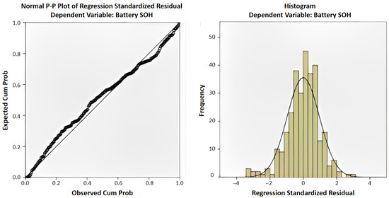 Furthermore, Figure 9 shows the residual in the results of multiple regression analysis. From the normal P-P plot of the regression standardized residual, it can be seen that the distribution of the expected and observed cumulative probability is nearly linear. Moreover, from the histogram of the residual, it can be seen that the distribution of the regression standardized residual is close to normal distribution. In view of this, the evaluation index parameters have a clear linear relationship with the objective variable (SOH); therefore, the results of multiple regression analysis are valid and statistically significant.