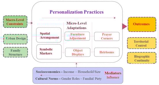Our conceptual framework (Figure 1) illustrates how these theories converge to demonstrate personalization’s mediating role between macro-level constraints (urban design, family structure) and micro-level practices (object display, spatial rearrangement), ultimately producing two key outcomes: territorial control, measured through household decision-making continuity, and sustained through curated possessions that bridge past and present selves. As depicted in Figure 1, personalization enhances control through macro constraints, such as urban design and family structure, while micro-adaptations, such as furniture arranging and object displays, facilitate territorial control through household decision-making processes. Simultaneously, biographical continuity is maintained through cherished possessions that serve as symbolic markers, including religious items and heritage objects. These processes are mediated by socioeconomic factors, such as income and household size, as well as cultural norms encompassing gender roles and familial piety, collectively shaping how individuals navigate and personalize their living environments.