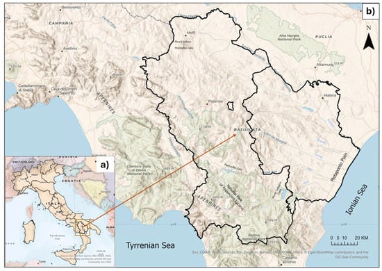 Location of the Basilicata region within national context. The main territorial features and towns (a,b) of the Region are also depicted.