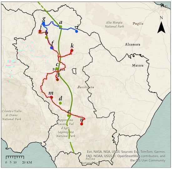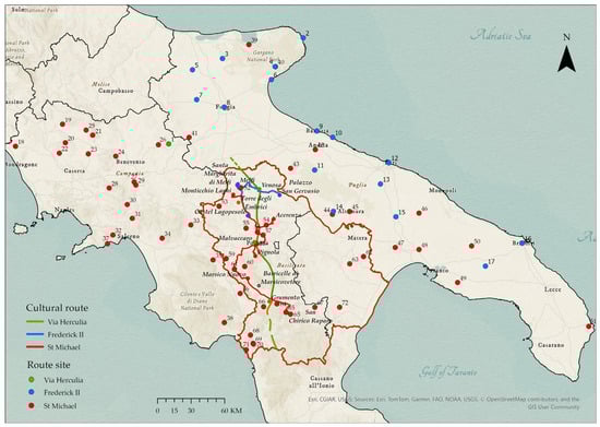 As a result, three thematic cultural routes are laid out across the province of Potenza (Figure 3): (1) a route built around the ancient Roman road system (Via Herculia), (2) a route on the places of the emperor Frederick II of Swabia (1194–1250) and (3) an itinerary focusing on the places of worship for the Archangel Michael (or Sant’Angelo). These itineraries are grounded in the principle of endogenous local development, as emphasize the activation and valorization of resources already embedded within the territory, such as architectural, archaeological and rupestrian heritage, through the direct involvement of local communities. Therefore, by building upon existing cultural and historical capital, the routes aim to preserve and promote the identity of the area and stimulate sustainable socio-economic growth from within, rather than relying on external drivers.