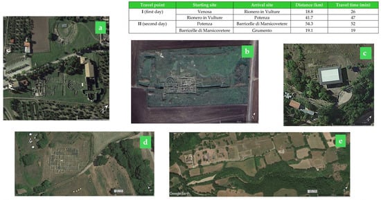 (a) Venosa, archaeological park-400 mt. s.l.m.; (b) Rionero in Vulture-Torre degli Embrici, villa-542 mt. s.l.m.; (c) Potenza-Malvaccaro, villa-775 mt. s.l.m.; (d) Marsicovetere-Barricelle, villa-655 mt. s.l.m.; (e) Grumento, archaeological park-587 mt. s.l.m. (source: Google Earth™).