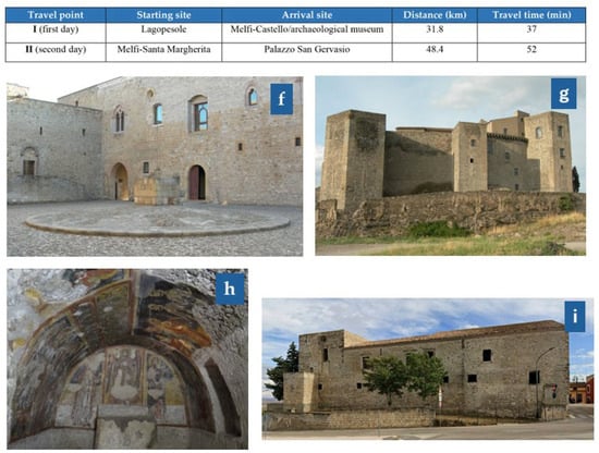 The network of fortresses, set up to control the territory of the Kingdom of Sicily, is considered one of the distinctive elements of Frederick II of Swabia’s policy, carried out across Apulia and Basilicata. Evidence of this efficient administrative and management strategy turns up in the “Statutum de reparatione castrorum”, drawn up between 1241 and 1245, which lays out a list of the kingdom’s castles, along with the obligation of maintenance handed over to local communities [101,102]. In Vulture, where the second proposed itinerary takes shape, there are significant traces that help piece together the legacy of the Swabian emperor. The route starts in Lagopesole, moves through Melfi and wraps up in Palazzo San Gervasio, covering a total distance of 80.2 km, split up into two days (Figure 5 and Figure 7).