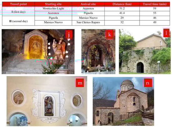 The cult of Saint Michael the Archangel in Basilicata probably stems from that of Monte Sant’Angelo in Gargano (Apulia). The veneration was passed down by the Lombards after pulling off a victory over the Byzantines under Emperor Constans II in 663 [121]. The selection of the place of worship was influenced by the presence of three natural elements: the cave, the hill and water. Since the earliest times, sanctuaries have been established near places marked by the presence of these three fundamental natural elements [122]. In Basilicata there are numerous structures dedicated to the Archangel, including rock-hewn sanctuaries, historic churches and centuries-old chapels [123,124] (Figure 3). In such a vast area, the cave sanctuaries of Monticchio, Acerenza, Pignola and San Chirico Raparo, along with the church of Marsico Nuovo, were selected to design the itinerary, covering a route of 173.6 kilometers, planned to be completed over two days (Figure 5 and Figure 8).