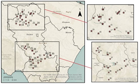 Map of Basilicata highlighting the two sub-areas, Vulture and Val d’Agri, along with key points of interest. The numbers correspond to sites detailed in the Supplementary File S2 named: “Sites Figure 9”.