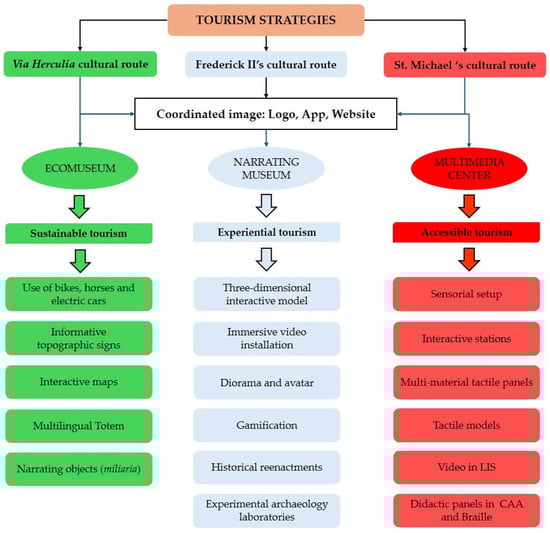 However, for each itinerary, it will be essential to develop tailored tools that cater to the diverse audiences each rout is expected to attract, while also aligning with the “Strategic Tourism Plan 2023–2027”, developed by the Italian Ministry of Tourism [151]. Based on the specificities of each itinerary, three strategic approaches and visitor engagement initiatives have been identified: for the Via Herculia, the establishment of an Ecomuseum to promote sustainable tourism; for the Frederick II’s Itinerary, the creation of a Narration Museum incorporating Digital Storytelling to enhance emotional tourism; and for the Michaelic Path, the development of a multimedia center designed to ensure accessible tourism (Figure 10).