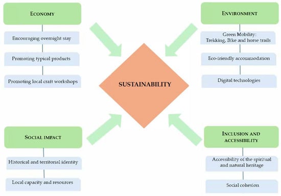 In line with the theory of endogenous local development, the itineraries have been mapped out by tapping into the internal resources of the territory, ranging from cultural and environmental heritage to local traditions and knowledge. This approach has already been successfully carried out in other European contexts, notably on the Greek island of Symi (Dodecanese). On Symi, a network of thematic cultural itineraries has been set up, effectively bringing together diverse local assets—including archaeological sites, historic buildings, monumental landmarks, and environmental resources—and leveraging them as catalysts for sustainable local development [157]. Furthermore, the itineraries proposed in this study aim to make the most of territorial resources, boost the local economy, minimize environmental impact, revive historical and territorial identity, and foster inclusiveness and accessibility—all in alignment with Sustainable Development Goals (SDG) 8 and 11. These three itineraries offer concrete solutions designed to drive sustainable tourism development in Basilicata, structured around four key pillars: economy, environment, social impact, and inclusivity and accessibility (Figure 11).