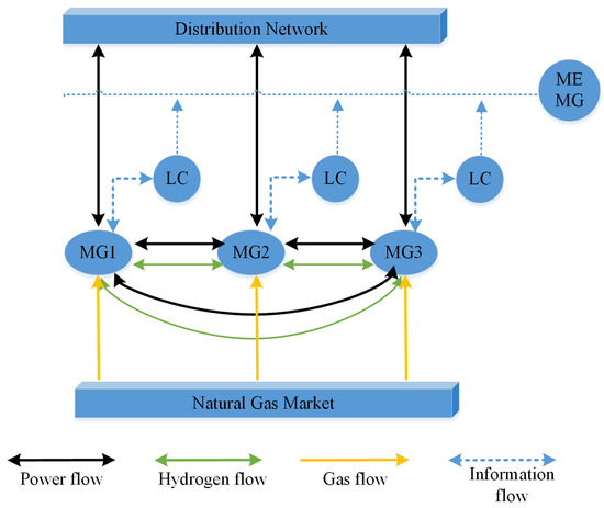 Against the backdrop of global energy transition, countries are actively exploring sustainable energy development paths to achieve secure, clean, and efficient energy supply [1]. Multi-energy microgrids (MGs) can achieve cooperation and mutual assistance among various heterogeneous energy sources, which can facilitate energy transformation and the realization of sustainable development [2,3]. With the increasing penetration of renewable energy in the distribution network, many neighboring MGs in the same distribution area will form a multi-energy multi-microgrid (MEMG) network [4]. The emergence of MEMG networks makes collaborative optimization between MGs feasible by means of energy trading, thereby further reducing their own operating costs and carbon dioxide emissions [5]. However, in practice, each MG belongs to different stakeholders, and their complex interests and information barriers will bring great challenges to the operation and management of the MEMG system [6].