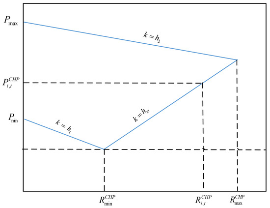 where is the thermal power of the CHP unit, and are the thermoelectric conversion coefficients corresponding to the minimum output power and the maximum output power , and is the linear supply slope of the CHP unit thermoelectric power. is the thermoelectric power corresponding to the lowest generation power of the CHP unit.