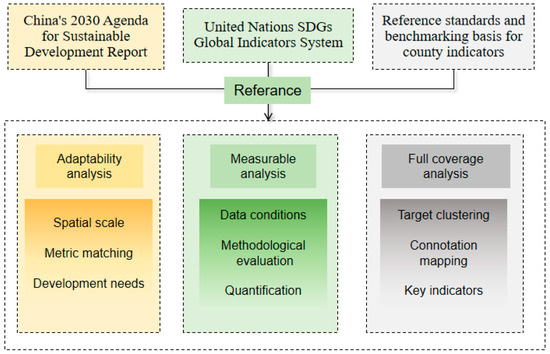This study systematically considers the conditions underlying the assessment of 17 objectives, 169 sub-objectives, and 232 indicators in the context of the SDGs and retains the indicators for which counties have reliable data sources. Indicators that cannot be used directly are replaced with reference to China’s country programs for the implementation of the 2030 Agenda for Sustainable Development and the benchmarking basis for county indicators. Considering the special characteristics of Chinese counties, new indicators are introduced to meet county-level assessment needs, the basic connotation of the SDGs is mapped to specific indicators of county construction, and key indicators closely related to sustainable development are identified. Adaptability analysis, measurable analysis, and full-coverage analysis are carried out on the indicators to ensure their applicability on the spatial scale from the global level to the county level and to ensure data quality and availability to finalize the evaluation index system of sustainable development in the county. Figure 1 illustrates the above-mentioned indicator transfer scheme from the United Nations to the county level.
