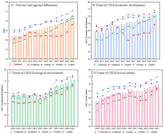 Based on the CSDI indicator system, we examined the trends of economic development, social culture, and ecological environment in different regions. From 2010 to 2021, China’s CSDI showed positive trends in these areas. Nationally, the CSDI for economic development rose from 59.41 in 2010 to 71.23 in 2021, with the northeast showing a relatively large decline from 64.51 to 53.10 in the 2013–2016 period, mainly due to the impact of a series of national decapacitation policies, which shut down a number of iron and steel mills, coal mines, and other enterprises in the face of overcapacity in traditional industries. There was a greater impact on county economy in the northeast region as it relies on traditional heavy industry. Both the eastern and central regions are at a superior level of performance in the field of economic development, and the trend changes in these two regions show a high degree of consistency, reflecting the effectiveness of China’s policy of coordinated regional development; the two regions have formed a good synergistic development relationship in industry. The western region saw the most significant growth, from 53.50 to 69.89. As a key node of the Silk Road Economic Belt, the western region has become an important participant in and beneficiary of the “One Belt, One Road” initiative.