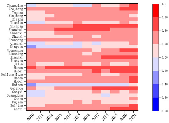 Figure 3 shows that the coupling coordination of Chinese provinces continues to improve, with the central region performing optimally, but there are significant differences in the transition speed between regions, with fluctuations prominent in resource-dependent regions. China’s provincial coupling coordination scores showed consistent improvement during the 2010–2021 period, with the national average rising from 0.67 to 0.76. Most provinces showed continuous optimization, with a total of 12 provinces reaching a coupling coordination score of 0.8 or above in 2021, showing a high level of coupling. Six provinces are in the central region, indicating that they are in the leading position regarding their ability to develop in a balanced manner. Some provinces showed obvious fluctuations in individual years, such as Chongqing, whose score rose to 0.65 in 2013, dropped sharply to 0.52 in 2015, and then rose gradually to 0.804 in 2021, which shows that the Chongqing Municipality is facing an adjustment in its development model and changes in resource and environmental constraints at different stages, resulting in obvious fluctuations in the coordination score of each system. Ningxia and Hainan made the greatest progress in coordinated development, with scores of less than 0.5 in 2010 and scores of more than 0.6 in 2021, gradually adjusting from being on the verge of dislocation to a state of initial coordination. From a regional perspective, the overall score of the eastern region is relatively high and shows a fluctuating upward trend, and the good economic foundation provides a good basis for the coordinated development of the eastern provinces. The fluctuating scores of the northeast region are more obvious as the region’s traditional industries account for a large proportion of the total, and it faces challenges in the process of economic transformation, making coordinated development in various fields difficult.